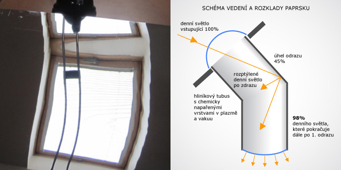 - Množství světla: výrobce uvádí odrazivost 99,7%. Směrová odrazivost pod úhlem dopadu paprsku 45 st. pro denní světlo směrem do místnosti v tubusu je však dle laboratorních testů pouze 50%. Takový úhel dopadu paprsků na odrazný povrch tubusu je typický pro světlovodný tubus a měří jeho schopnost denní světlo skutečně přivádět. A proč se toto děje? Proč při měření odrazivosti pod úhlem 90st má povrch 99,5%? A pod uhlem 45st má jen 50%? Opět zasáhly fyzikální zákony, když se podíváte na odrazný povrch tubusu právě pod úhlem 45st a proti světlu, spatříte nerovný povrch, pomerančovou strukturu, která vzniká nanesením odrazné folie na hliníkový tubus. A co to způsobí? Polovina množství světla se při odrazu rozpadne do mnoha malých paprsků, které už nemají sílu pokračovat svou cestou tubusem, ztratí se ještě, než mohou přiletět do místnosti a světla v místnosti není dostatek.